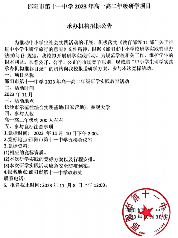 邵阳市第十一中学2023年高一高二年级研学项目承办机构招标公告